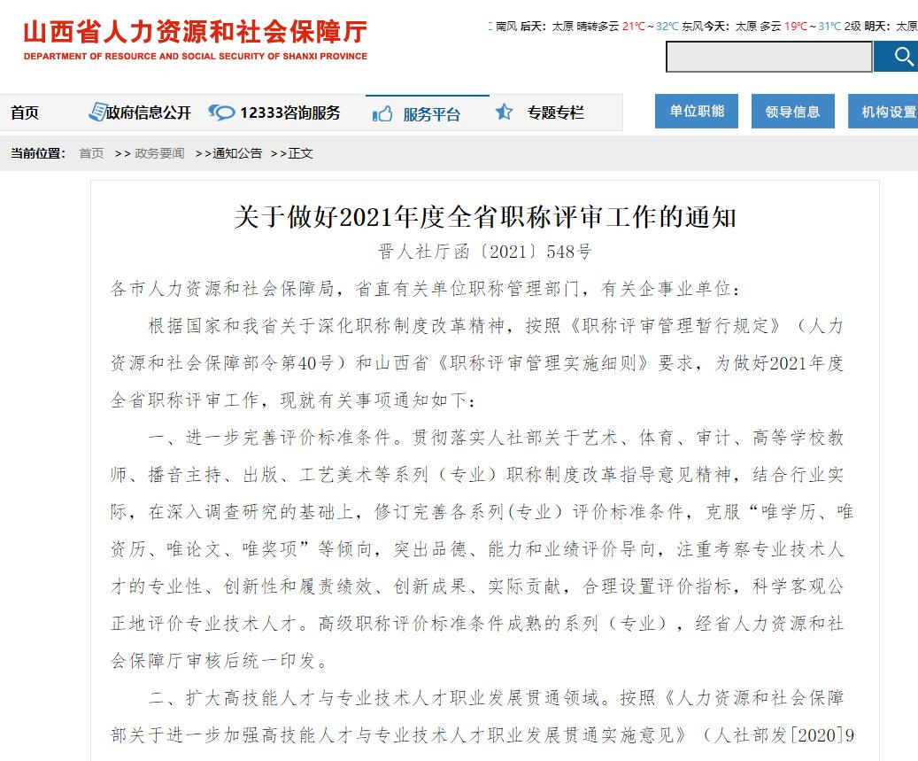 關(guān)于做好2021年度全省職稱評審工作的通知 晉人社廳函〔2021〕548號(hào)